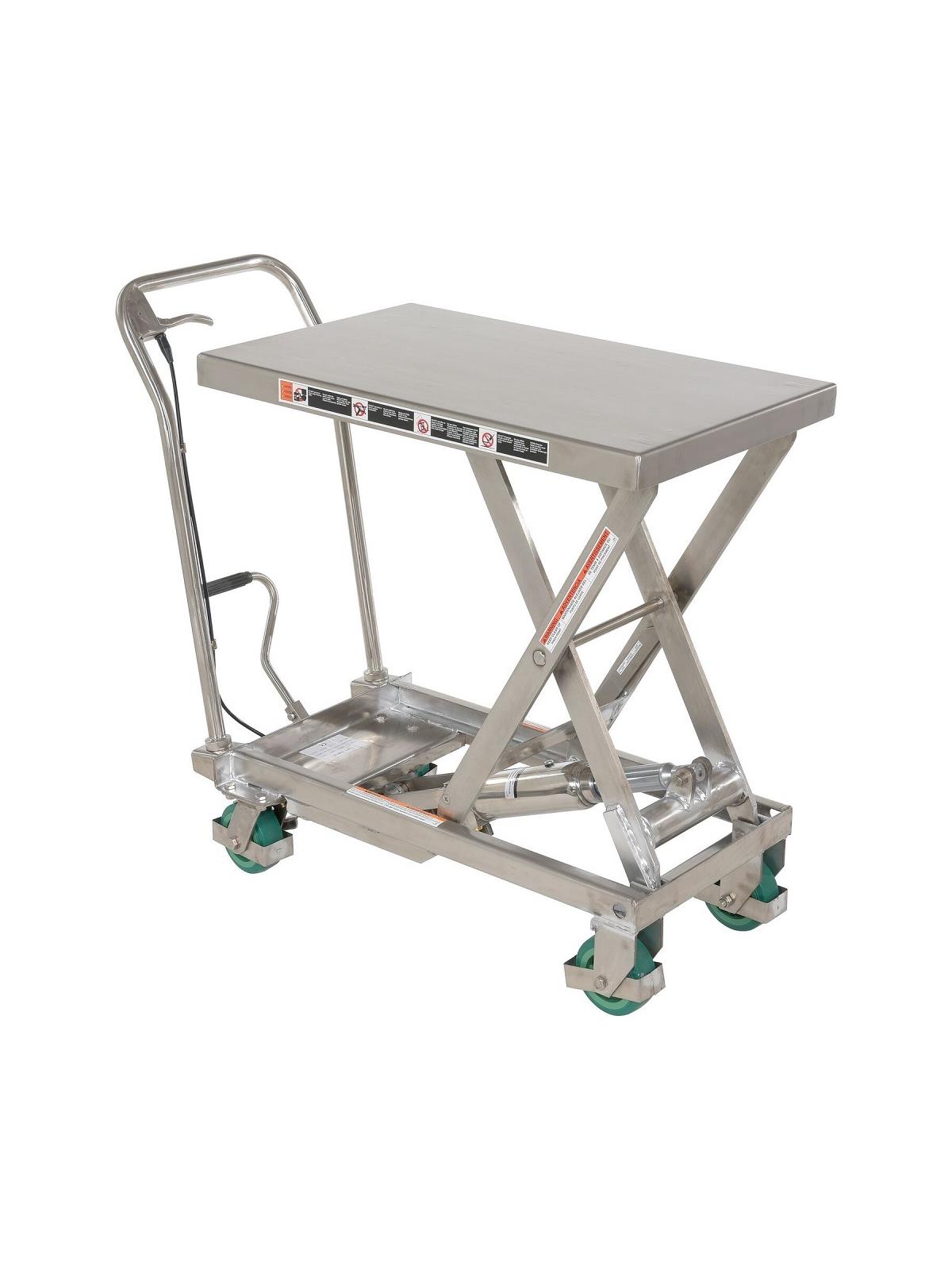 Our fully welded stainless steel carts resist corrosion and wet environments. -SS3 Models are made of 316 Stainless Steel. All parts on the -SS & the -SS2 models are made from 304 grade stainless steel, including the hydraulic pump and foot pedal. These carts are suitable for most food, medical, and pharmaceutical industry settings. Also suitable for wash-down applications. 2 rigid and 2 swivel polyurethane wheels with brakes standard.  FOB Shipping Point.