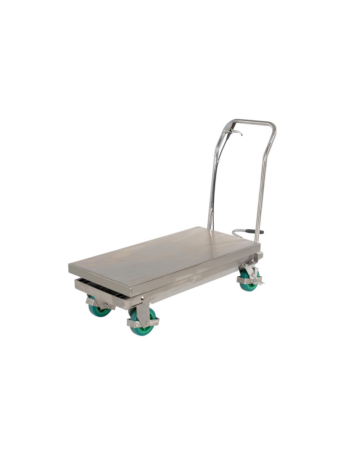 Our fully welded Stainless Steel Carts resist corrosion and wet environments. All parts are made from 304 or 316 grade stainless steel, including the hydraulic pump and foot pedal. These carts are suitable for most food, medical, and pharmaceutical industry settings. Also suitable for wash-down applications. 2 rigid and 2 swivel polyurethane wheels with brakes standard. Units feature a high quality actuated, single-speed hydraulic pump. FOB Shipping Point.