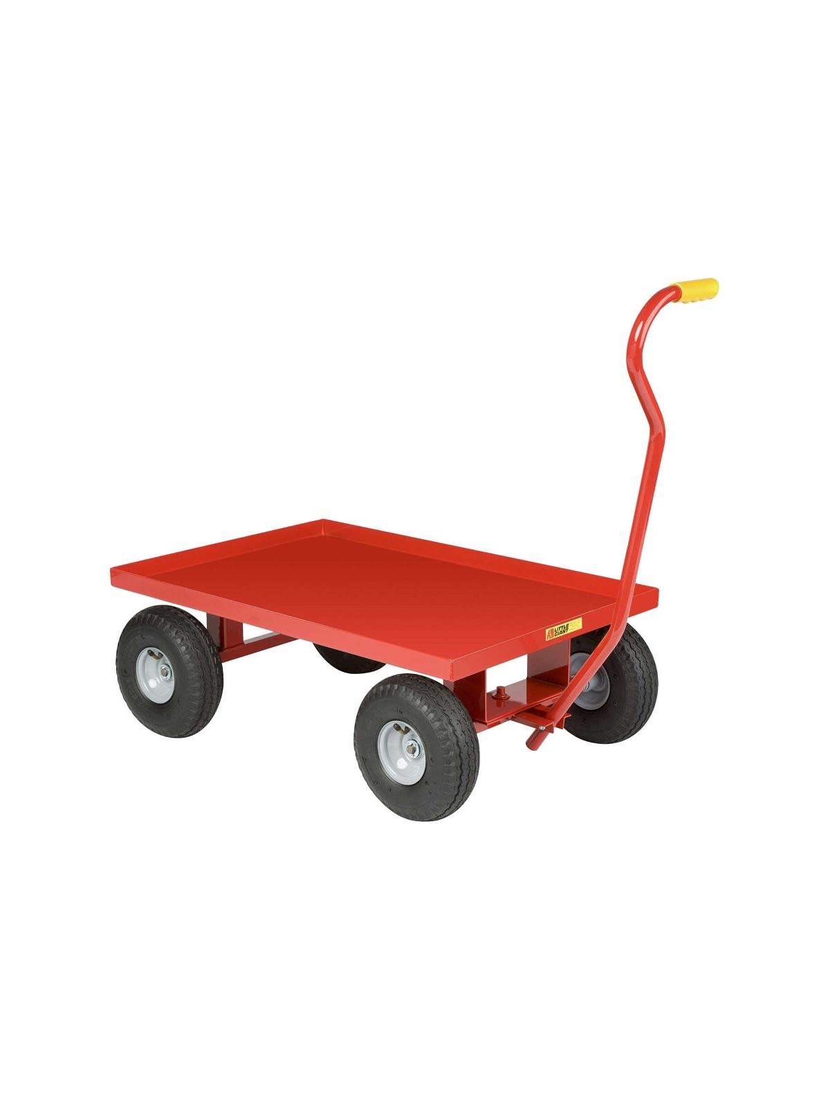 Choice of puncture proof rubber wheels, or pneumatic wheels. Pull handle has vinyl hand grip. Wagons have 1-1/2" retaining lip around the edges that help confine the load. Solid steel deck offers maximum durability. Perforated steel deck allows dirt and moisture to pass through. Deck size is 24" W x 36" L. Durable powder coat Red finish. Ships fully assembled via small package carrier. FOB Shipping Point.