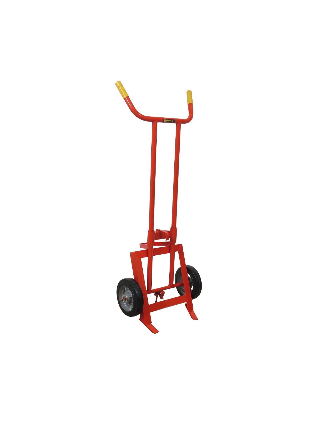 Machined steel load wheels behind nose prong help ease the lifting of drum. Classic single bar frame design. Kickstand. 24"W. at handle. 16.25"W. at nose.