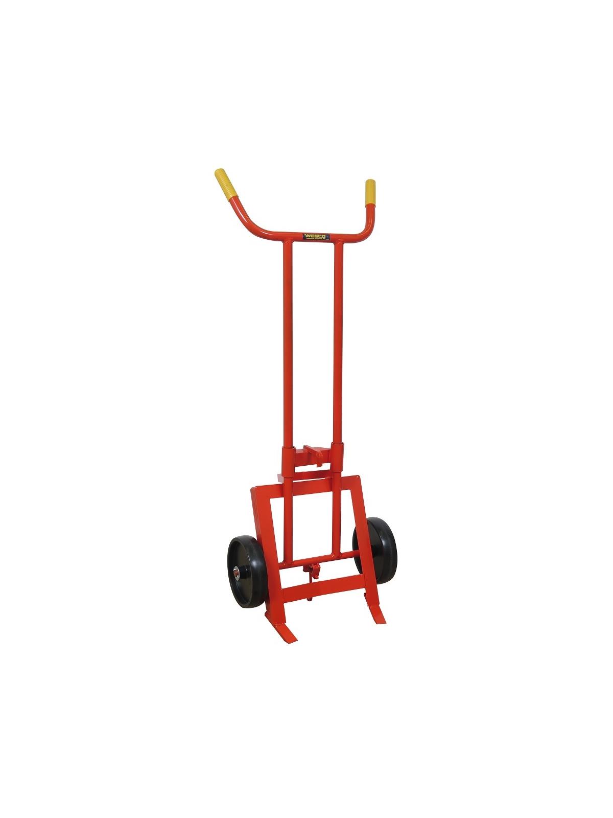Machined steel load wheels behind nose prong help ease the lifting of drum. Classic single bar frame design. Kickstand. 24"W. at handle. 16.25"W. at nose.