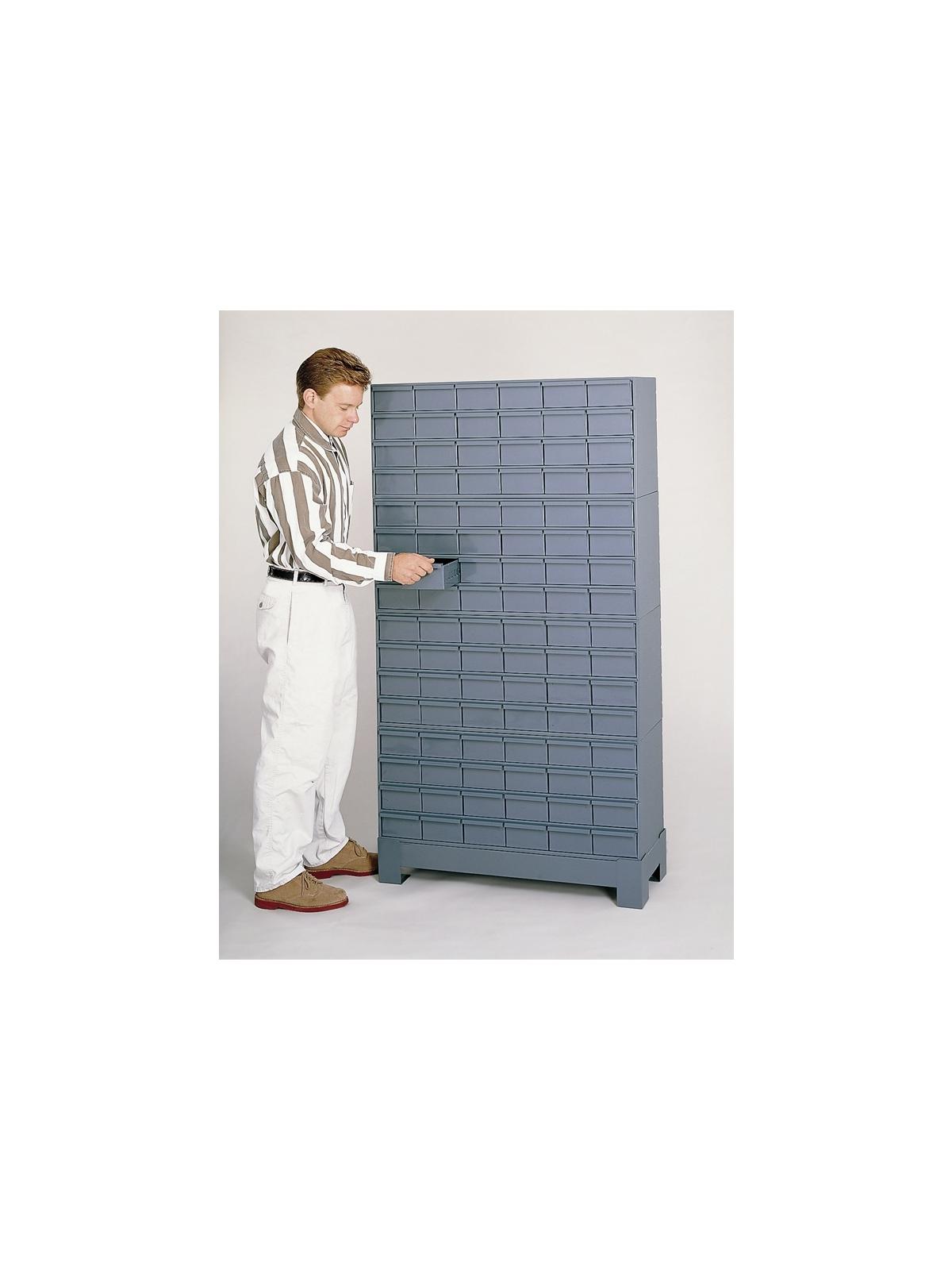 Full-width handle drawers open easily thanks to two embossed runners.  Positive stop prevents spilling. Each drawer comes with 2 dividers. Shipped assembled. Includes base. Gray powder coat finish. FOB Shipping Point.