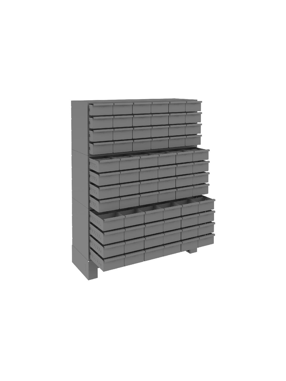 Full-width handle drawers open easily thanks to two embossed runners. Positive stop prevents spilling. Each drawer comes with 2 dividers. Shipped assembled. Includes base. Gray powder coat finish. FOB Shipping Point.