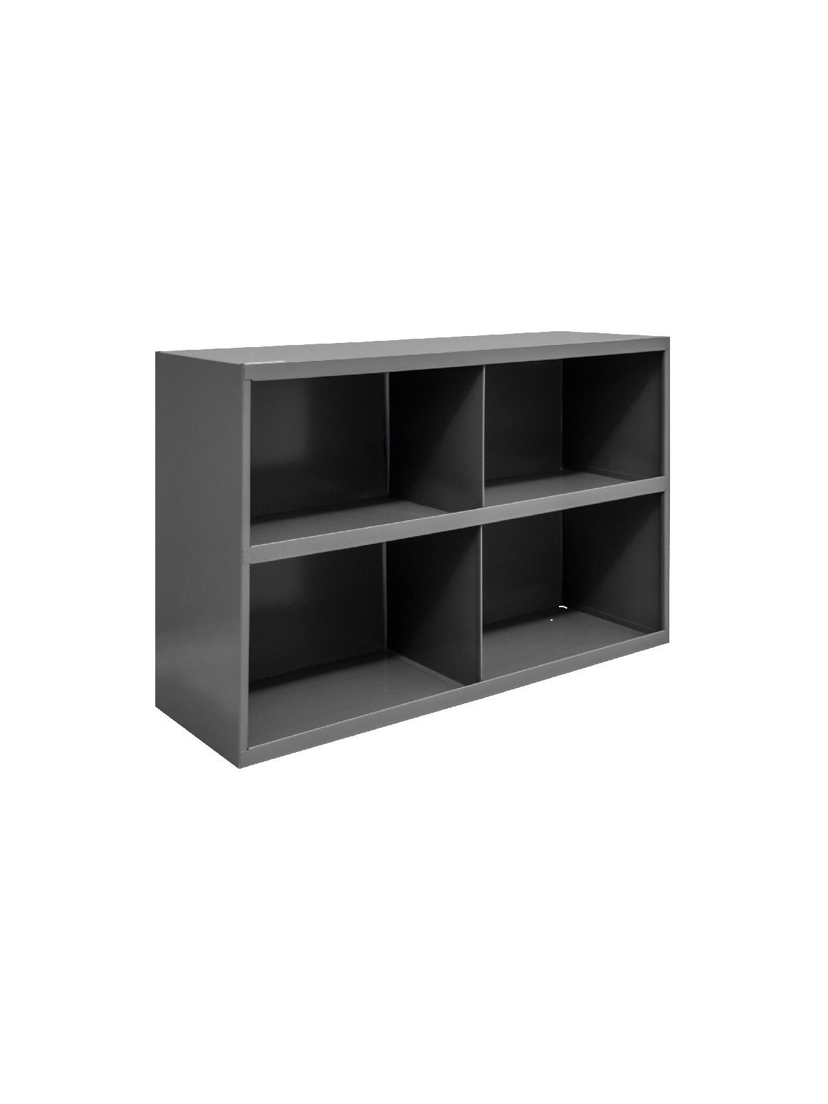 Roll-formed sides for increased strength and stability. Newly redesigned slope shelves. Ribbed and hemmed dividers provide added strength. Optional base available. Ships fully assembled ready for use. Durable gray powder coat finish. FOB Shipping Point.