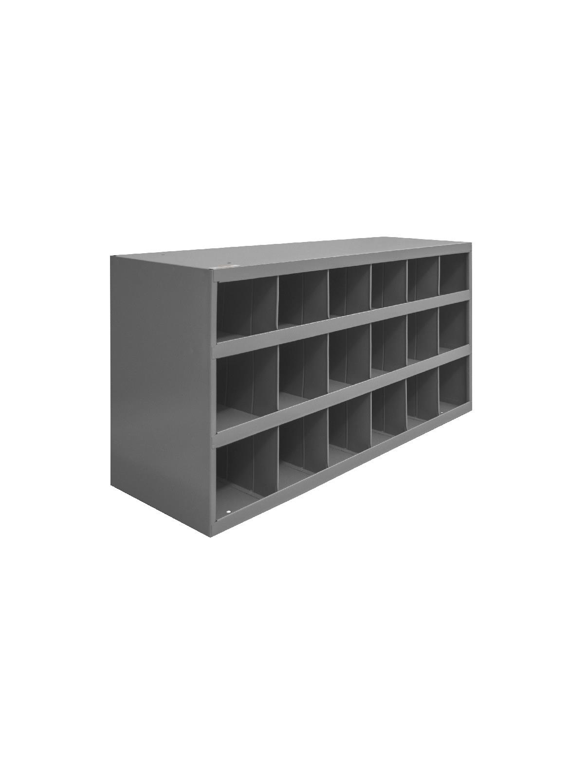 Roll-formed sides for increased strength and stability. Newly redesigned slope shelves. Ribbed and hemmed dividers provide added strength. Optional base available. Ships fully assembled ready for use. Durable gray powder coat finish. FOB Shipping Point.