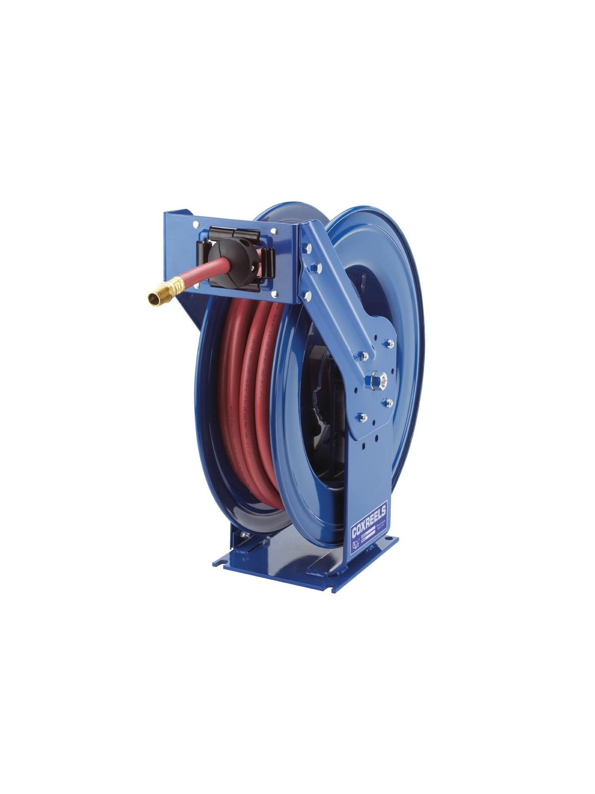 Pedestal style base and arms support reel on both sides. Triple support points to the center shaft. Auto-rewind for fast easy pay out and take up. Smooth non-snag roller guides reduce positioning. Multi- position arm guide adjusts for wall, ceiling, or floor mounting. FOB Shipping Point.