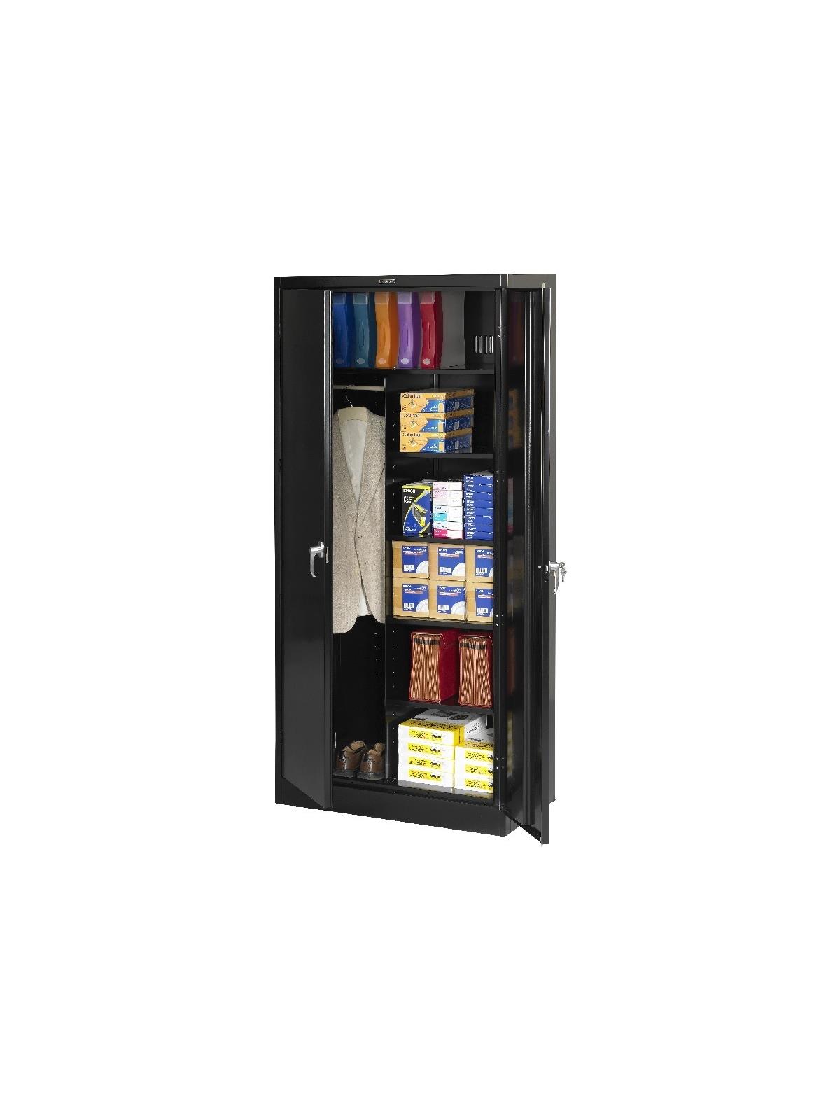 Knuckle hinges on each door insure the integrity of the cabinet and the alignment of the doors. Doors are reinforced for strength and quietness. Handle on right-hand door activates a 3-point system for added security; dummy handle on left-hand door. Shelves are adjustable in 2" increments on built-in shelf tabs. Shelves will hold up to 200 lbs. evenly distributed. Two front leveling glides compensate for uneven floors. Louvered back panel allows air circulation in the cabinet. Available in four models--storage, wardrobe, combination, and counter high cabinets. Available in Black, Champagne/Putty, Sand, Light Gray and Medium Gray. FOB Shipping Point.
