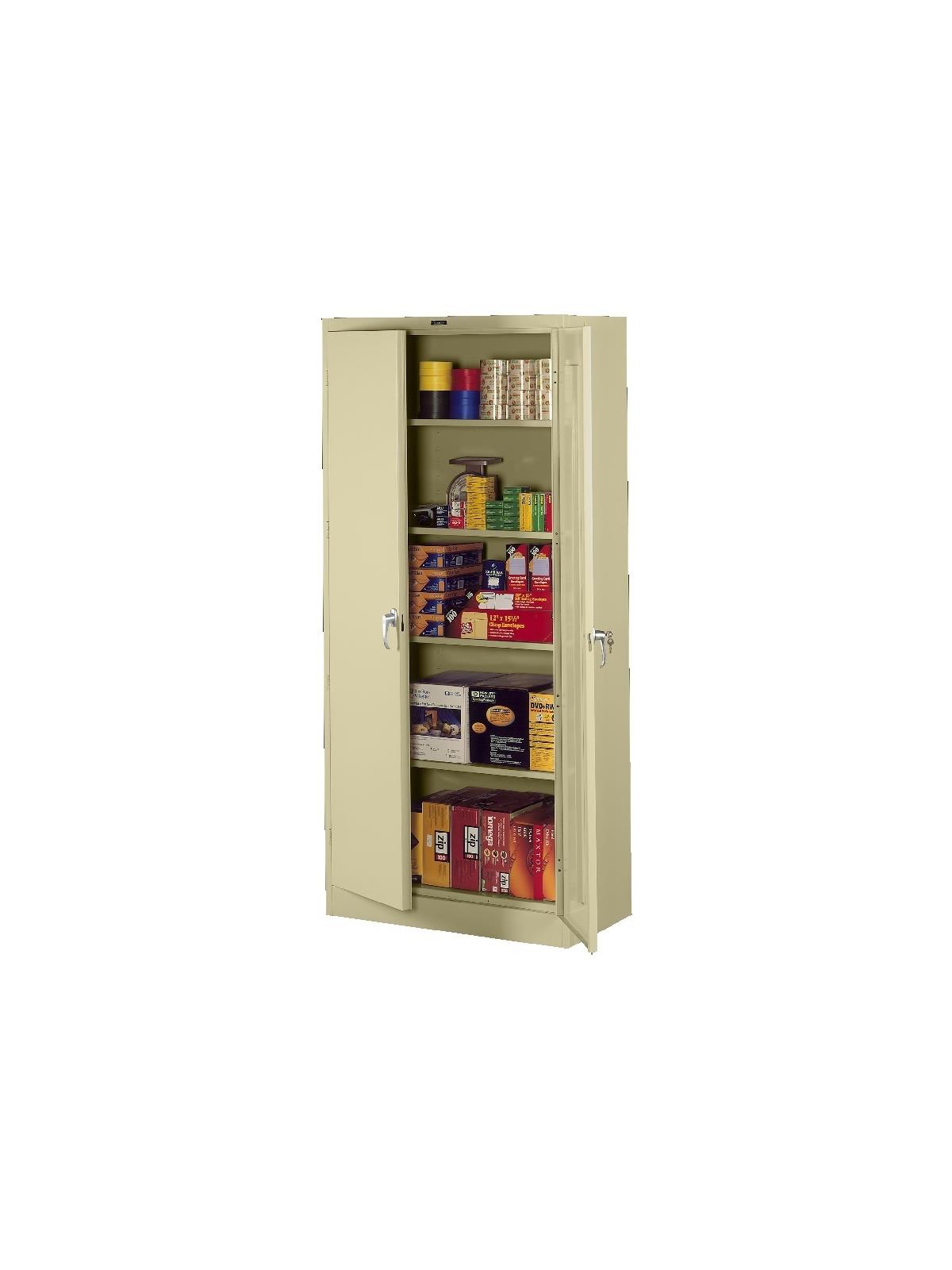 Knuckle hinges on each door insure the integrity of the cabinet and the alignment of the doors. Doors are reinforced for strength and quietness. Handle on right-hand door activates a 3-point system for added security; dummy handle on left-hand door. Shelves are adjustable in 2" increments on built-in shelf tabs. Shelves will hold up to 200 lbs. evenly distributed. Two front leveling glides compensate for uneven floors. Louvered back panel allows air circulation in the cabinet. Available in four models--storage, wardrobe, combination, and counter high cabinets. Available in Black, Champagne/Putty, Sand, Light Gray and Medium Gray. FOB Shipping Point.