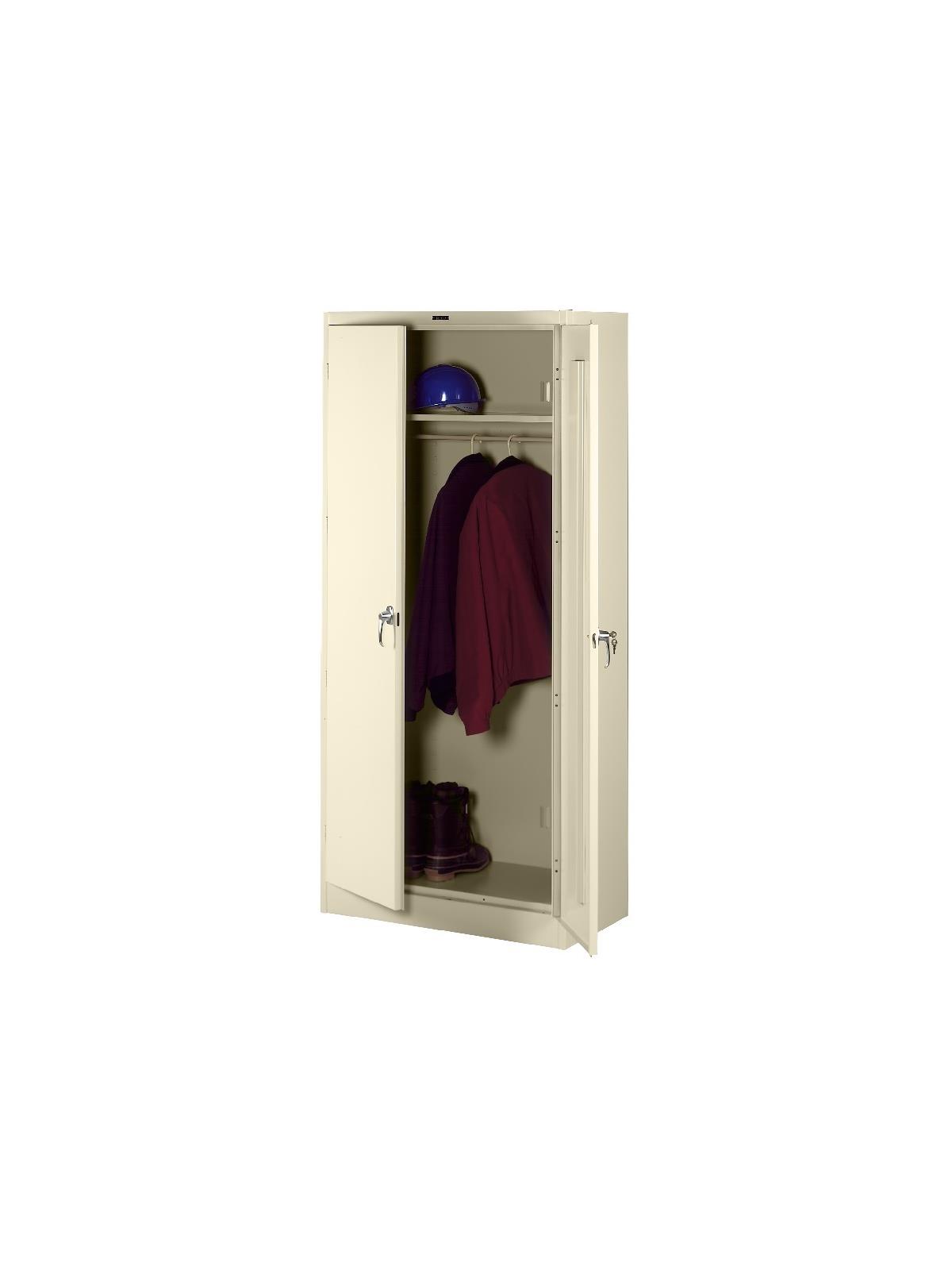 Knuckle hinges on each door insure the integrity of the cabinet and the alignment of the doors. Doors are reinforced for strength and quietness. Handle on right-hand door activates a 3-point system for added security; dummy handle on left-hand door. Shelves are adjustable in 2" increments on built-in shelf tabs. Shelves will hold up to 200 lbs. evenly distributed. Two front leveling glides compensate for uneven floors. Louvered back panel allows air circulation in the cabinet. Available in four models--storage, wardrobe, combination, and counter high cabinets. Available in Black, Champagne/Putty, Sand, Light Gray and Medium Gray. FOB Shipping Point.