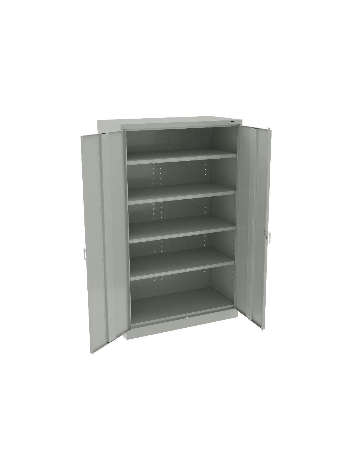Jumbo size for jumbo storage capacity. Two front leveling glides compensate for uneven floors. Four leaf hinges on each door insure the integrity of the cabinet and the alignment of the doors. Handle on right-hand door activates a three-point locking system for added security -- second handle on left-hand door. Shelves are adjustable in 2" increments on built-in shelf tabs. Shelves hold up to 400 lbs. evenly distributed. Unassembled cabinets ship in 2 cartons. Available in Black, Champagne/Putty, Sand, Light Gray and Medium Gray. FOB Shipping Point.