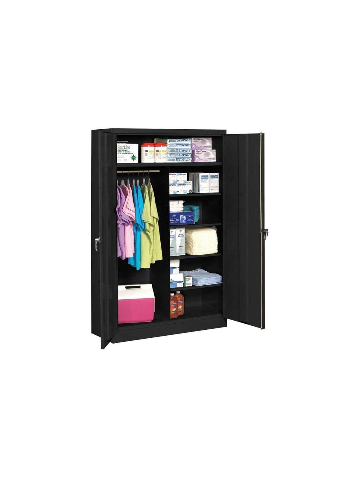 Jumbo size for jumbo storage capacity. Two front leveling glides compensate for uneven floors. Four leaf hinges on each door insure the integrity of the cabinet and the alignment of the doors. Handle on right-hand door activates a three-point locking system for added security -- second handle on left-hand door. Shelves are adjustable in 2" increments on built-in shelf tabs. Shelves hold up to 400 lbs. evenly distributed. Unassembled cabinets ship in 2 cartons. Available in Black, Champagne/Putty, Sand, Light Gray and Medium Gray. FOB Shipping Point.