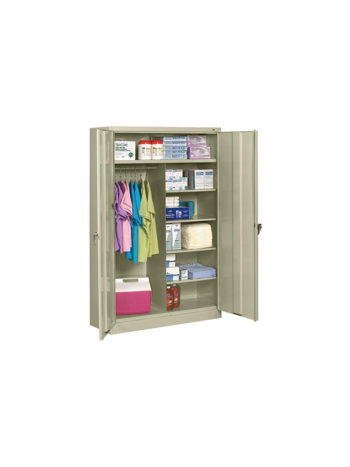Jumbo size for jumbo storage capacity. Two front leveling glides compensate for uneven floors. Four leaf hinges on each door insure the integrity of the cabinet and the alignment of the doors. Handle on right-hand door activates a three-point locking system for added security -- second handle on left-hand door. Shelves are adjustable in 2" increments on built-in shelf tabs. Shelves hold up to 400 lbs. evenly distributed. Unassembled cabinets ship in 2 cartons. Available in Black, Champagne/Putty, Sand, Light Gray and Medium Gray. FOB Shipping Point.