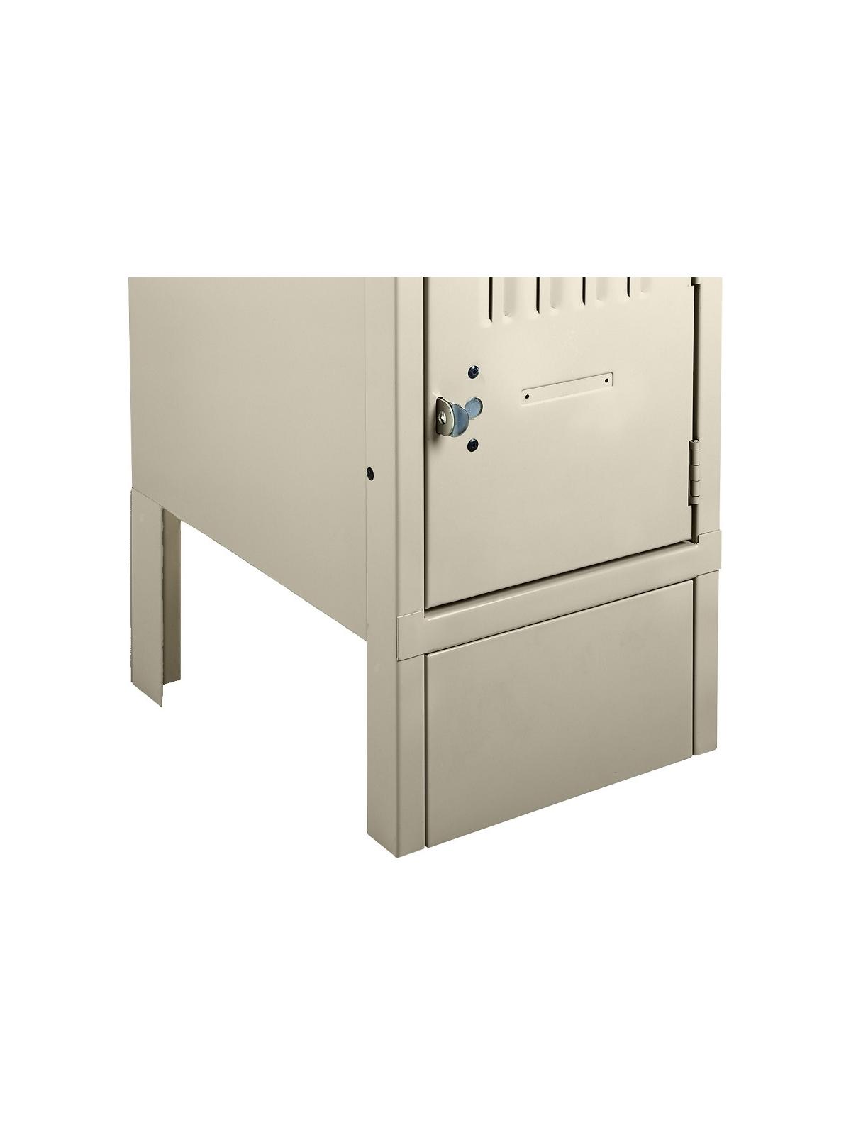 Create a flush, finished appearance with front and end base covers. Front covers fit between front legs and end covers fit between front and rear legs. Closed base prevents dirt and dust build up under lockers. Available in Sand or Medium Gray. FOB Shipping Point.