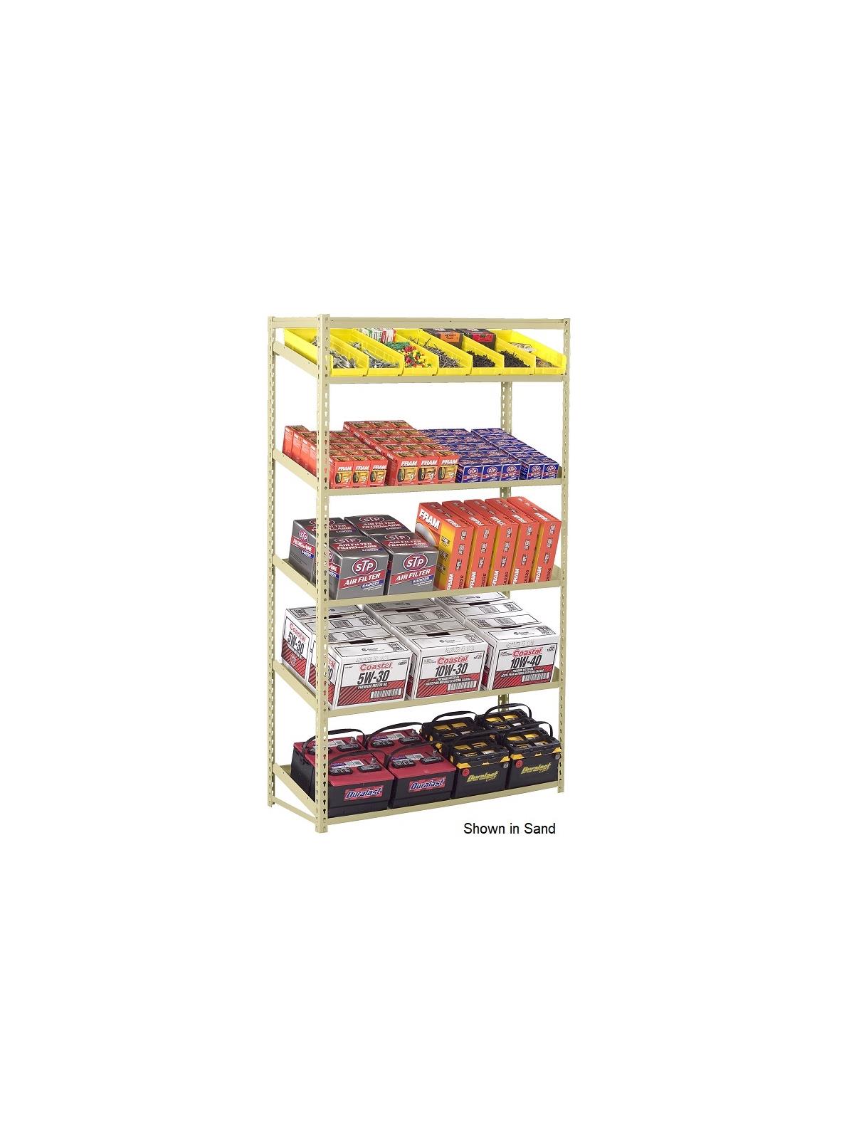 Parts, bins and boxes slide forward for easy picking. Open access from all sides. Place back to back to double shelf depth. Canopy top has box formed construction. Features 2" side flange to retain product. 1/2" front lip acts as a product stop. Heavy gauge shelf supports. Shelves support up to 450 lb. loads. Boltless construction - easy assembly with only a mallet. 5 sloping steel shelves per unit. 18"D. shelves slope 12 degrees. 24"D. shelves slope 14 degrees. Starter unit can be used individually or combined with adder units to form a row of shelving. Medium Gray or Sand finish. FOB Shipping Point.