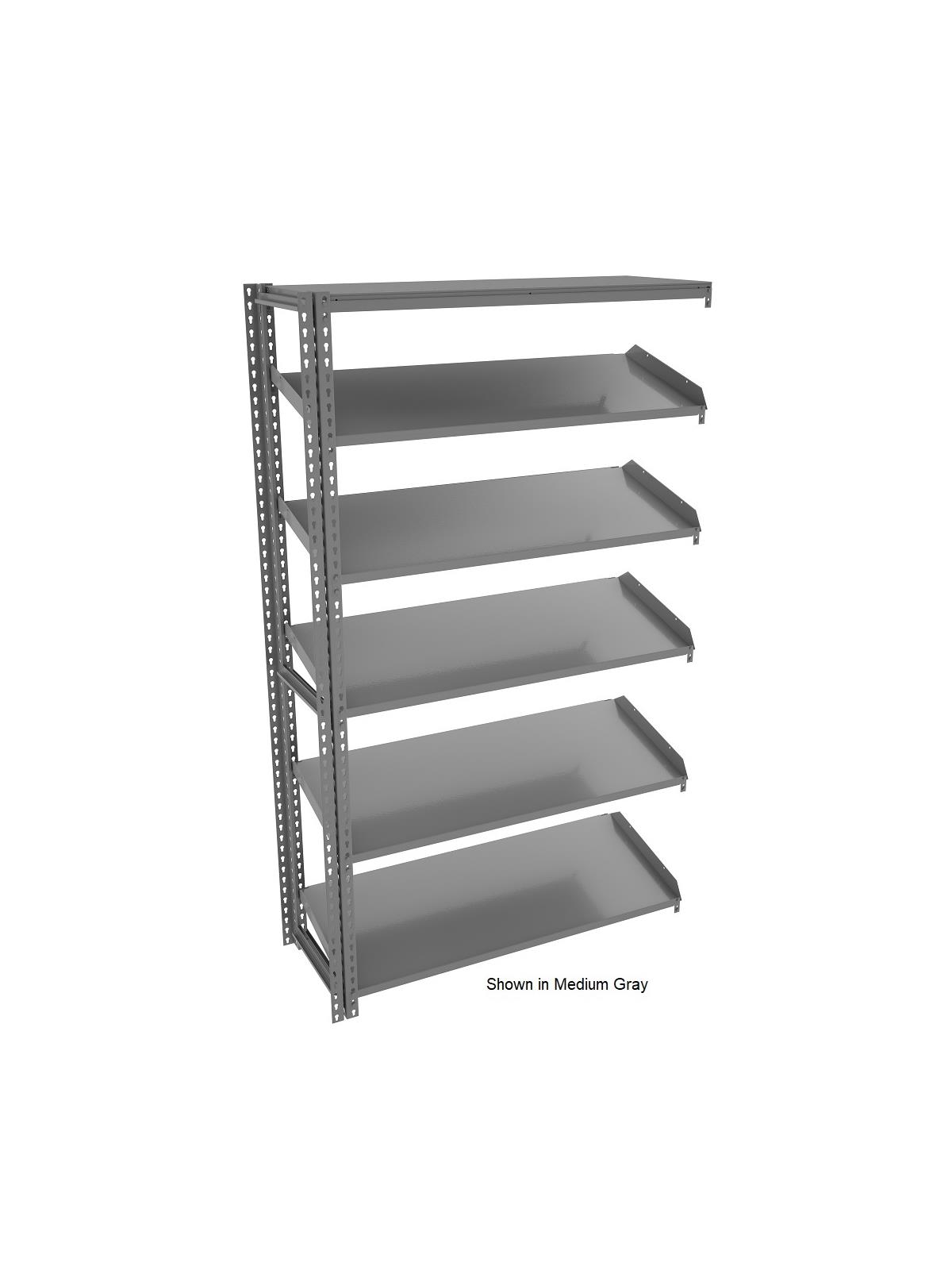 Parts, bins and boxes slide forward for easy picking. Open access from all sides. Place back to back to double shelf depth. Canopy top has box formed construction. Features 2" side flange to retain product. 1/2" front lip acts as a product stop. Heavy gauge shelf supports. Shelves support up to 450 lb. loads. Boltless construction - easy assembly with only a mallet. 5 sloping steel shelves per unit. 18"D. shelves slope 12 degrees. 24"D. shelves slope 14 degrees. Starter unit can be used individually or combined with adder units to form a row of shelving. Medium Gray or Sand finish. FOB Shipping Point.