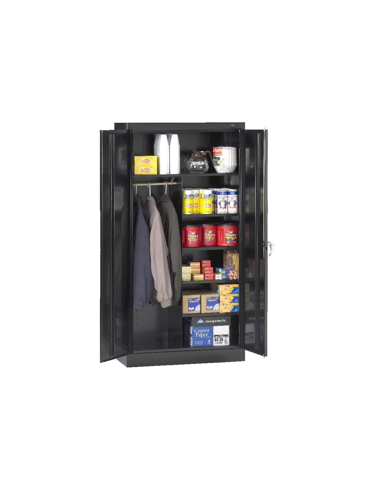 Shelves adjust in 2" increments. Heavy-steel construction with leaf hinges and reinforced doors stand up to a lifetime of heavy use. Handle on right-hand door activates the three-point locking system to keep belongings secure. Raised base keeps contents from contacting moisture from the floor. Available in 3 models--storage, wardrobe and combination. Available in Black, Champagne/Putty, Sand, Light Gray and Medium Gray. FOB Shipping Point.
