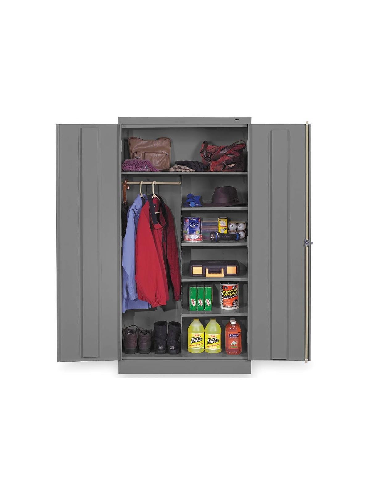 Shelves adjust in 2" increments. Heavy-steel construction with leaf hinges and reinforced doors stand up to a lifetime of heavy use. Handle on right-hand door activates the three-point locking system to keep belongings secure. Raised base keeps contents from contacting moisture from the floor. Available in 3 models--storage, wardrobe and combination. Available in Black, Champagne/Putty, Sand, Light Gray and Medium Gray. FOB Shipping Point.