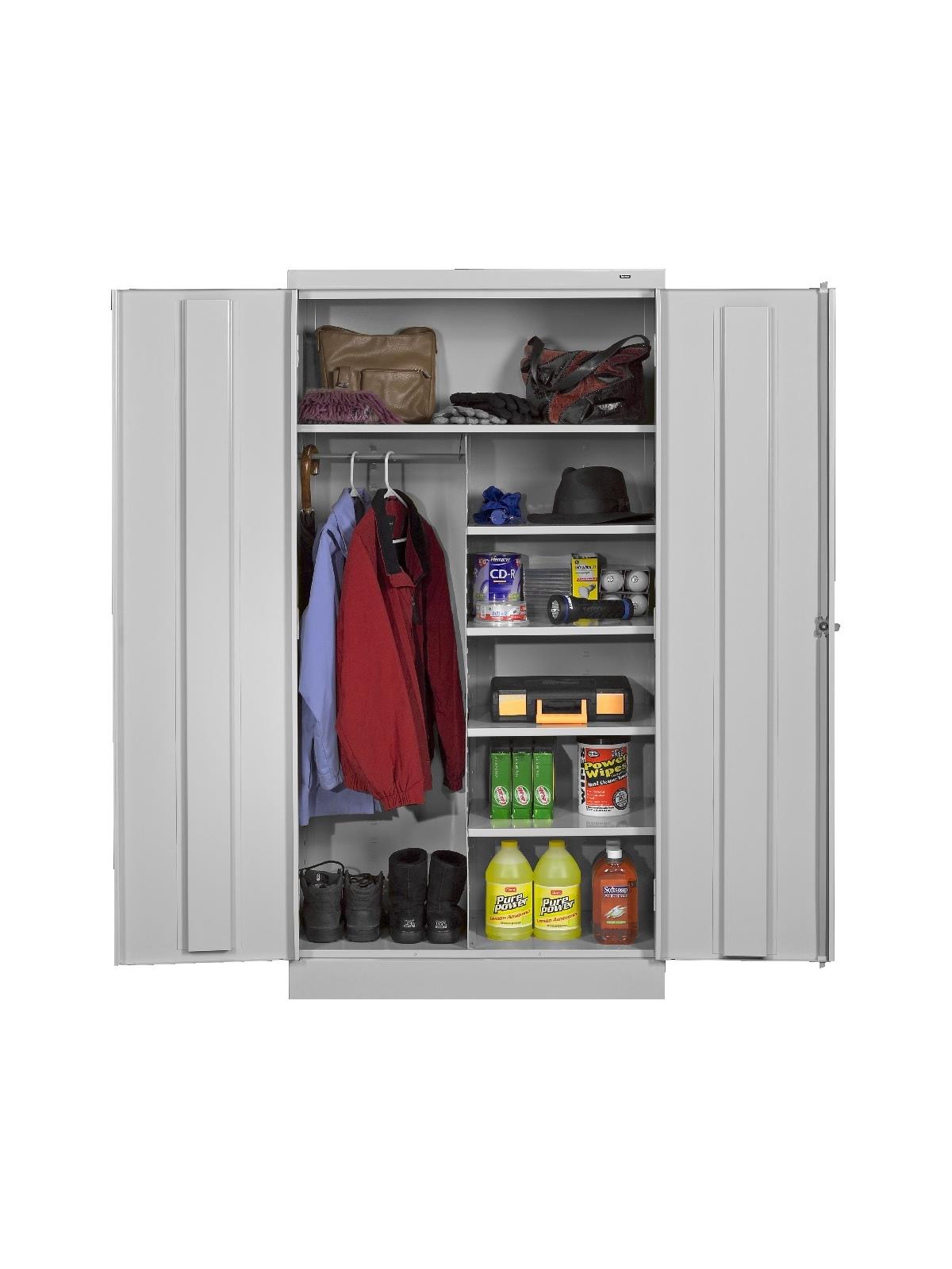 Shelves adjust in 2" increments. Heavy-steel construction with leaf hinges and reinforced doors stand up to a lifetime of heavy use. Handle on right-hand door activates the three-point locking system to keep belongings secure. Raised base keeps contents from contacting moisture from the floor. Available in 3 models--storage, wardrobe and combination. Available in Black, Champagne/Putty, Sand, Light Gray and Medium Gray. FOB Shipping Point.