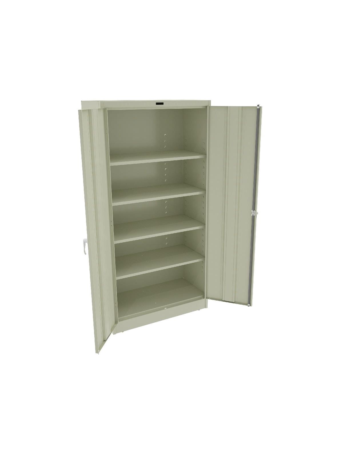 Shelves adjust in 2" increments. Heavy-steel construction with leaf hinges and reinforced doors stand up to a lifetime of heavy use. Handle on right-hand door activates the three-point locking system to keep belongings secure. Raised base keeps contents from contacting moisture from the floor. Available in 3 models--storage, wardrobe and combination. Available in Black, Champagne/Putty, Sand, Light Gray and Medium Gray. FOB Shipping Point.