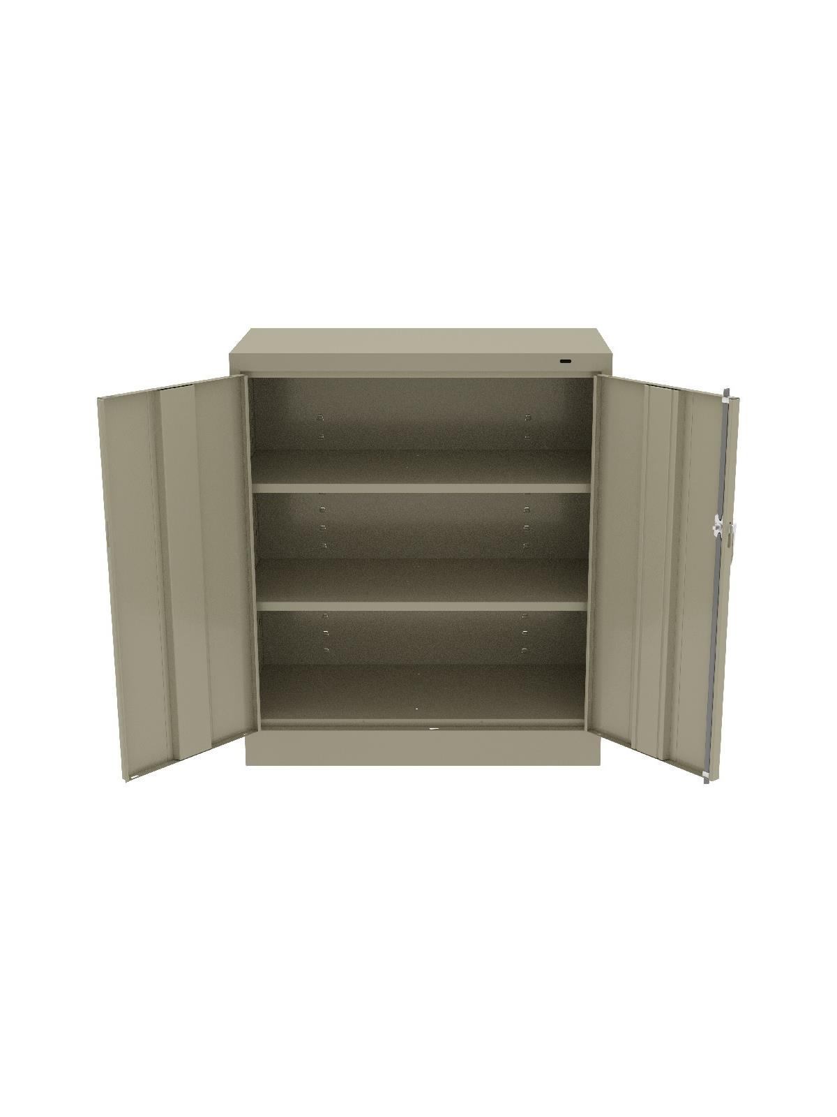 Shelves adjust in 2" increments. Heavy-steel construction with leaf hinges and reinforced doors stand up to a lifetime of heavy use. Handle on right-hand door activates the three-point locking system to keep belongings secure. Raised base keeps contents from contacting moisture from the floor. Available in Black, Champagne/Putty (shown), Sand, Light Gray and Medium Gray (shown). FOB Shipping Point.