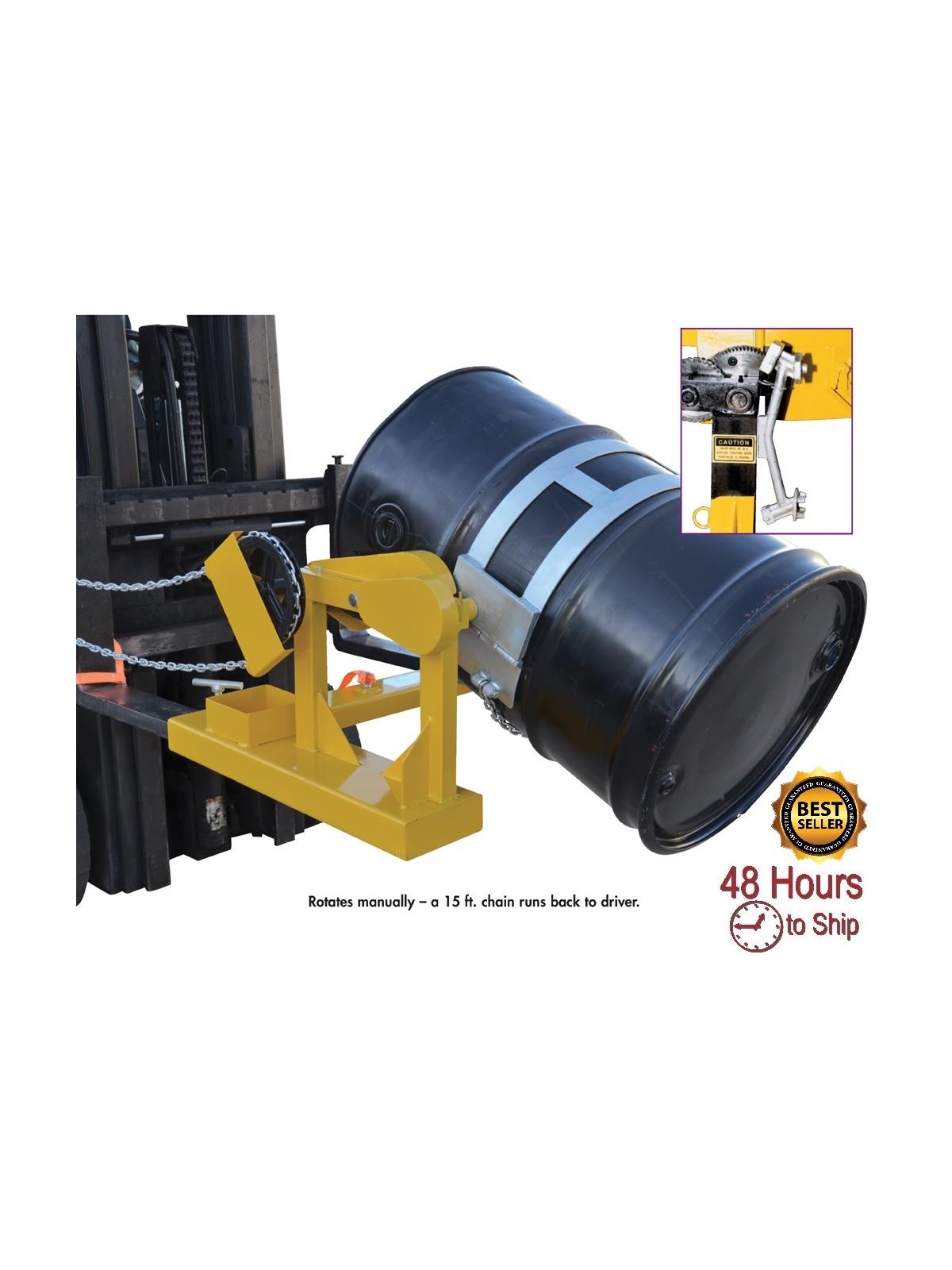Safety restraint securely attaches to forklift. Drums must be full to rotate at rated capacity. Fork pockets measure 7"W x 2-5/8"H I.D. on 31-3/8" centers. Rotates manually - a 15' chain runs back to driver. FOB Shipping Point.