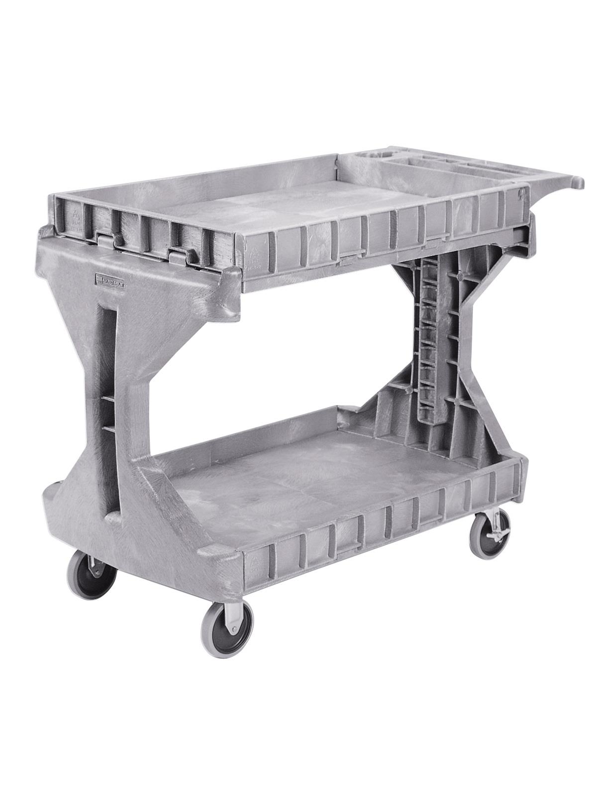 Engineered to adapt to all the ways and the places you work. Quickly converts to a flat-top or a box-top cart with one hand. Hinged side gates on both shelves flip up or down for different cart configurations - no tools necessary. Flat-top for sliding boxes on and off shelves and box-top to secure cartons during transport. Made of high-density polyethylene structural foam - panels are dent-resistant, and rust-proof. Innovative I-beam design allows for easy loading and unloading of oversized boxes on the lower shelf. Rounded corners and edges prevent mishaps. Handles loads up to 400 lbs. Features supply compartments for easy access to small items. Comfortable full-width handle. Easy rolling on durable, non-marking 5" ball bearing wheels - includes rear locking casters. Available in Gray. FOB Shipping Point.