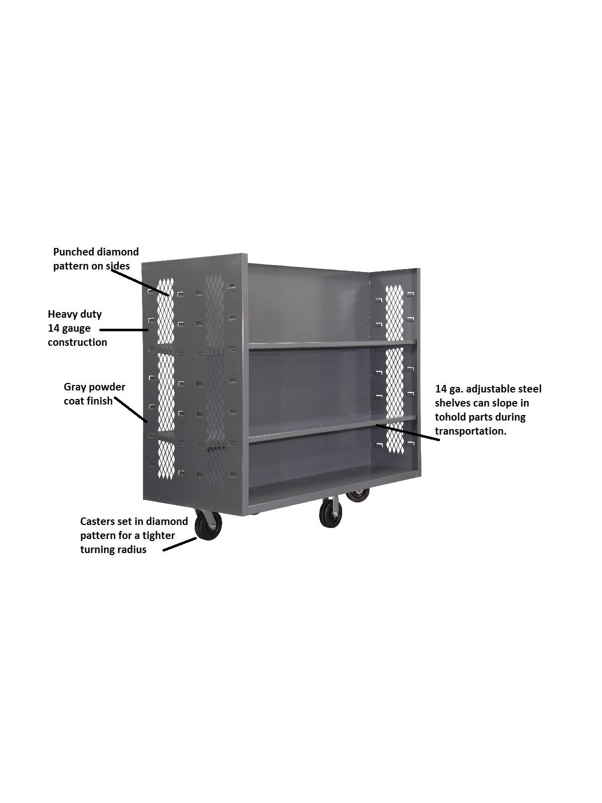 Features 2 sided design for greater efficiency and see-through mesh sides. All units are 48" above the deck. Center panel makes it easy to see on-board items. 2000 lb. model rolls on 6" phenolic casters: 2 rigid, 2 swivel.  Durable Gray powder coat finish. FOB Shipping Point.
