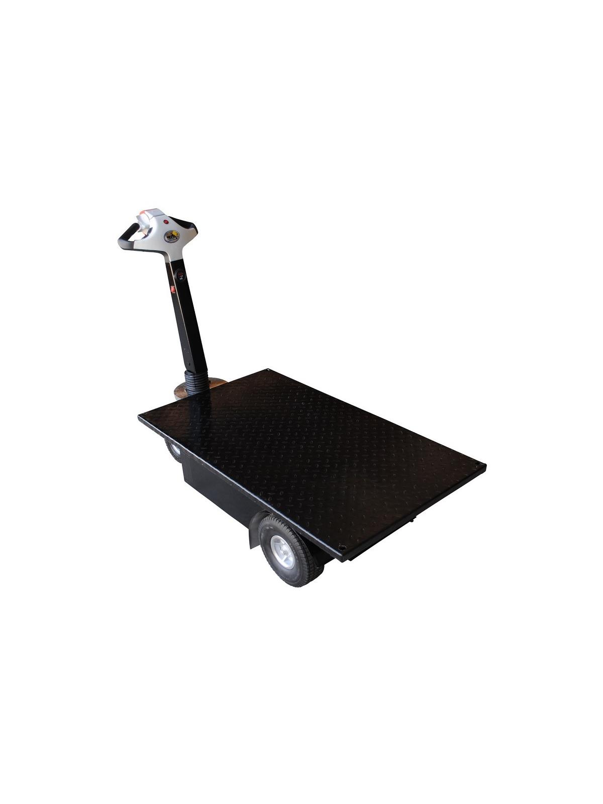 Unique carts feature built-in traction-drive system for easy transportability. Ideal for applications including mail rooms, hospitals, supermarkets, hotels and warehouses. Features 450W electric drive motor with two 12V batteries for power. 110V AC internal battery charger is included along with battery level indicator. Variable throttle speed control for precise maneuvering and positioning is located in the handle. Units roll smoothly on (2) 9" x 3-1/4" solid foam rubber steering wheels and (2) 10" x 3-1/4" solid foam drive wheels. Walking speed is 0-2.8 mph when unloaded and 0-1.5 mph when loaded. Speed control is conveniently located in handle. Handle pivots back towards operator and includes horn and emergency stop. Maximum incline is 7 degrees. Each shelf includes a tread plate surface. Deck height 14". FOB Shipping Point.
