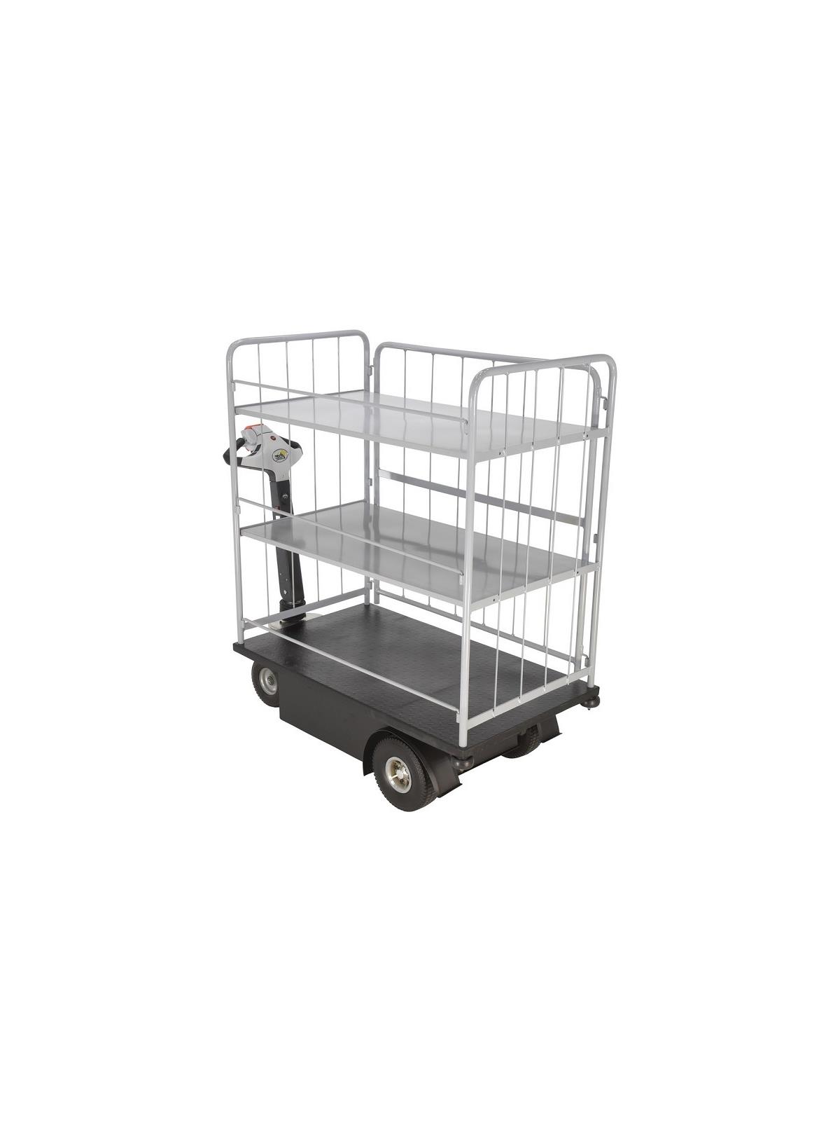 Unique carts feature built-in traction-drive system for easy transportability. Ideal for applications including mail rooms, hospitals, supermarkets, hotels and warehouses. Features 450W electric drive motor with two 12V batteries for power. 110V AC internal battery charger is included along with battery level indicator. Variable throttle speed control for precise maneuvering and positioning is located in the handle. Units roll smoothly on (2) 9" x 3-1/4" solid foam rubber steering wheels and (2) 10" x 3-1/4" solid foam drive wheels. Walking speed is 0-2.8 mph when unloaded and 0-1.5 mph when loaded. Speed control is conveniently located in handle. Handle pivots back towards operator and includes horn and emergency stop. Maximum incline is 7 degrees. Each shelf includes a tread plate surface. Deck height 14". FOB Shipping Point.