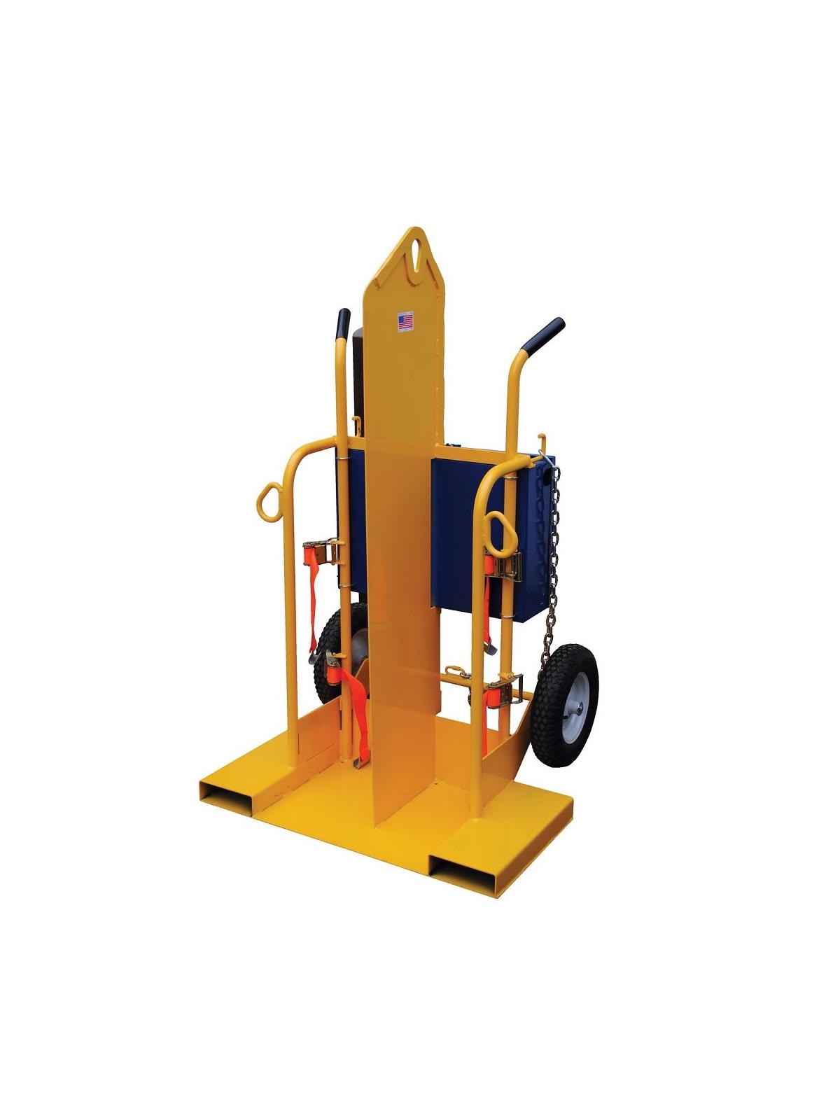 Designed for transporting cylinders and cutting torch. Includes two tank compartments with heavy-duty ratchet straps. Brackets are included for holding cutting torch and hose. Sturdy handles and large 16" diameter wheels for tilt-n-go portability. Heavy-duty uniform capacity rating is 500 lbs. HCYL-2 models include lockable storage box for regulators. Box includes hose opening so regulator does not need to be disconnected for storage. Lifting eye is 2" max. diameter, material thickness is 7/16". Usable size of each fork pocket is 7-1/2"W x 2-9/16"H. Units with fire protection include 1/2" (approximately 13mm) marinite 1 material, which provides a 30 minute fire protection barrier as described by OSHA standards 1910.253 and 1926.350. All units include cutting torch box, overhead lifting eye, and fork pockets. FOB Shipping Point.