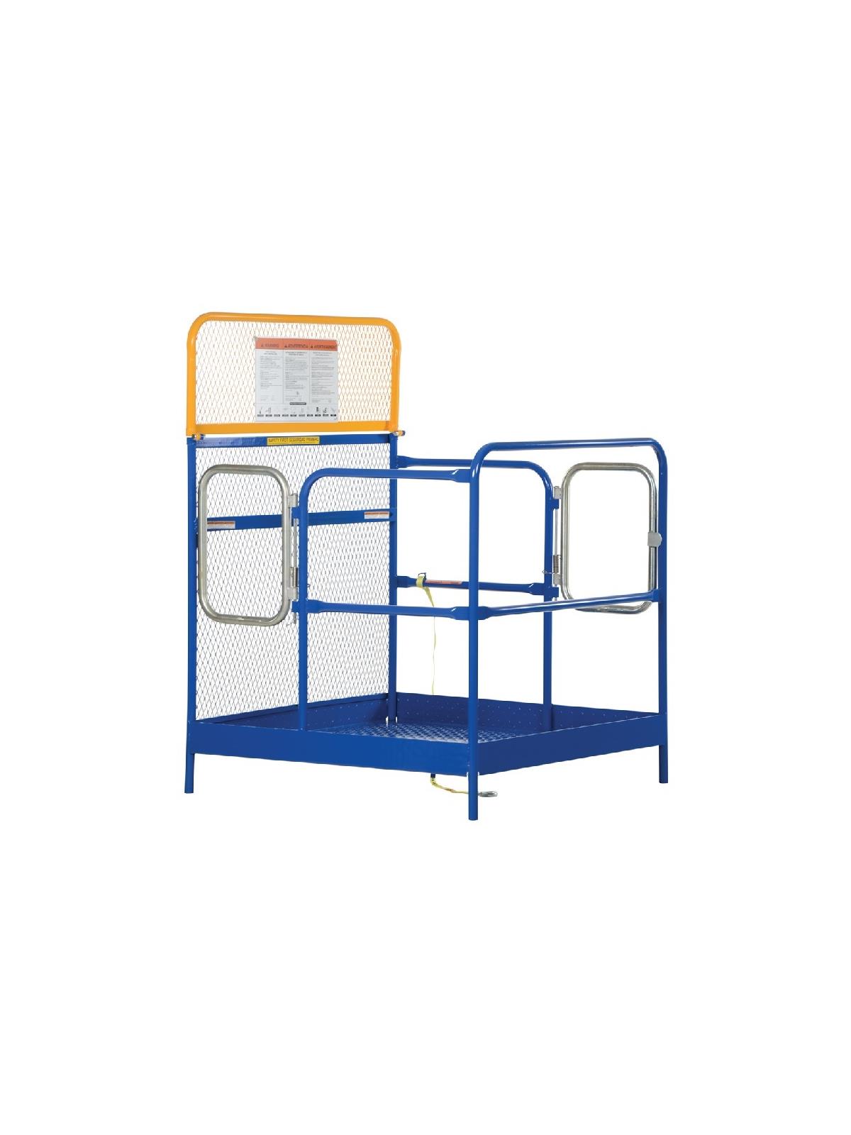 Convenient fork truck work platforms quickly and safely raise maintenance personnel where they are needed. Attaches to fork lift truck by inserting forks into fork pockets and securing platform to fork truck. Fork locks secure platform to forks and a 36" long safety restraint which hook attaches platform to fork truck. 42" high handrail with 21" high mid-rail on three sides. 60" high expanded metal backing on forth side (84" high backing to meet California OSHA available, call for details). Includes diamond plate platform. The usable fork pockets on single and dual side door entry are 7-3/4"W x 3-7/8"H in rear and 7-3/4"W x 1-7/8"H in front. The usable fork pockets on fold down work platform measure 7-7/8"W x 3-3/8"H on 27-3/4" centers. Steel construction with baked-in powder-coated toughness. FOB Shipping Point.