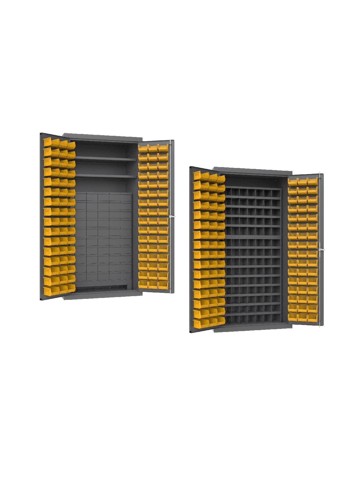 Cabinets are heavy duty 14 gauge construction and feature 2 adjustable shelves and louvered panels on doors for use with bins included. Doors have fully welded piano hinges and can hold up to 650 lbs. (weight evenly distributed). 96 Hook-on Bins® are also included. H3501-DLP-60DR11-96-2S-95 comes with 60 Jumbo, 3-1/2" H drawers, each with 2 dividers adjustable on 1" centers (extra dividers are available). H3501-DLP-72/40B-96-95 has 12" deep, 112 pigeon hole bins enclosed - perfect for storage of fasteners, high value small parts and more. Available in Gray powder coat finish. Ships fully assembled. FOB Shipping Point.