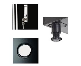 Durable all welded steel construction with durable black finish for lasting protection and beauty. Doors have full-length door pulls and a push button lock to keep cabinet secure. Heavy duty rounded legs with leveling guides to keep cabinets evenly leveled. Shelves adjust on 2" centers to accommodate various size items. 200 lb. capacity shelves; wall cabinet has 150 lb. capacity shelves. Cut-out access holes in back of cabinets allow cords through for charging. Drawer fully extends on ball-bearing slides. FOB Shipping Point.