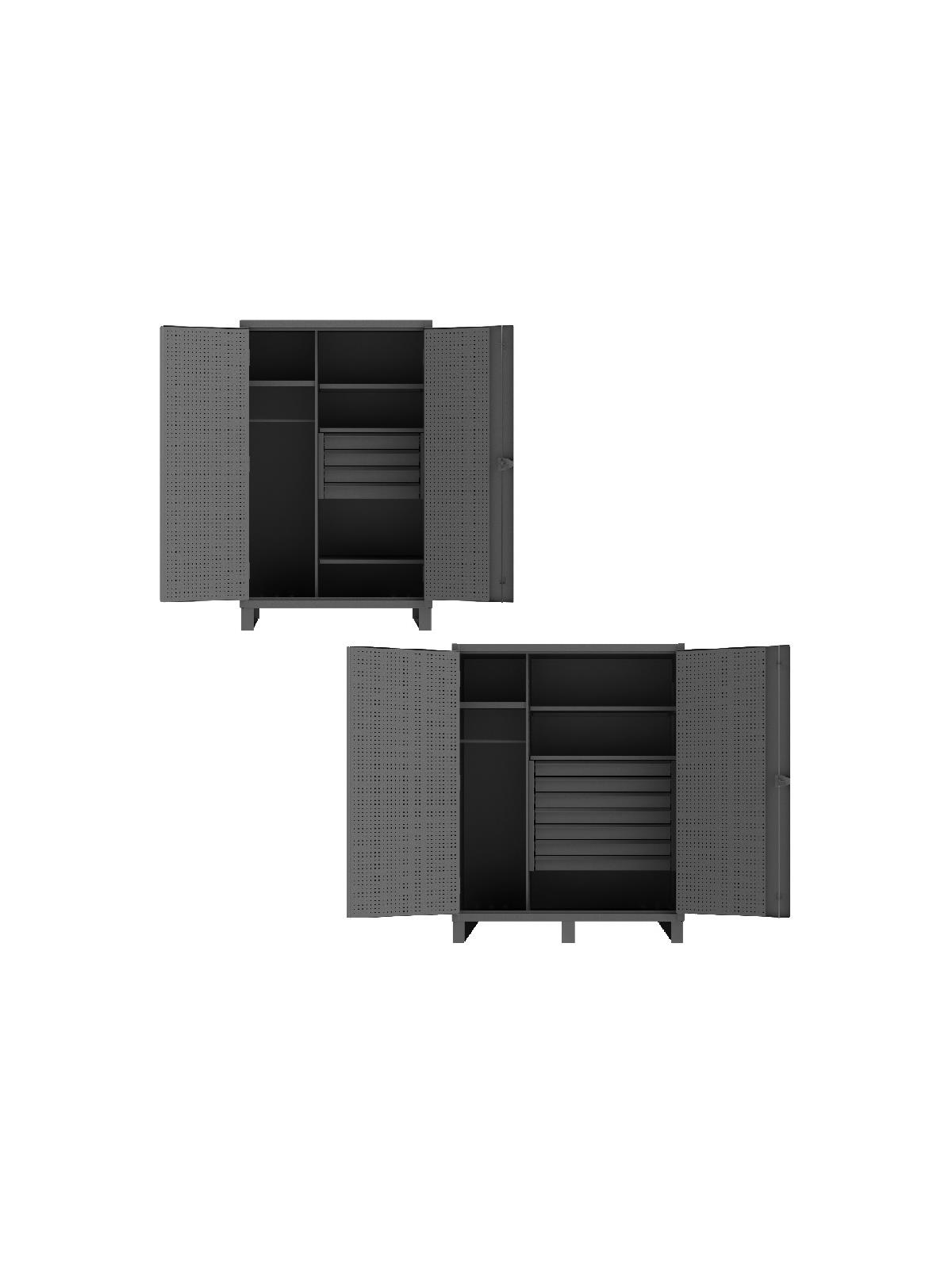 Shelves bolt into place easily using fasteners provided and adjust on 2-1/4" centers. 3-point locking systems with pad-lockable cast steel locking handle (pad-lock not included). Pegboard holes are punched on 1" centers and accommodate standard peg hooks. 14 gauge steel pegboard are welded to both doors. 6"H base/legs which provide access for forklifts; prepunched holes allow for lagging to the floor. Doors open at 180° for full access to product. Bearing slide drawers glide smoothly and have a 400 lb. capacity. Ships fully assembled. Durable, textured, gray powder coat finish. FOB Shipping Point.