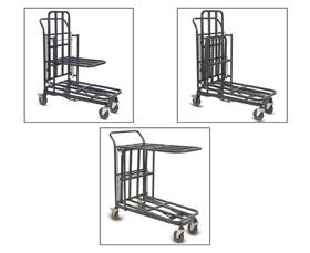 This versatile nesting stocking cart can carry up to 750 lbs. Top trays retract allowing space for bulky items. Nests in only 7.9" - saving space when not in use. Includes rear brakes. FOB Shipping Point.