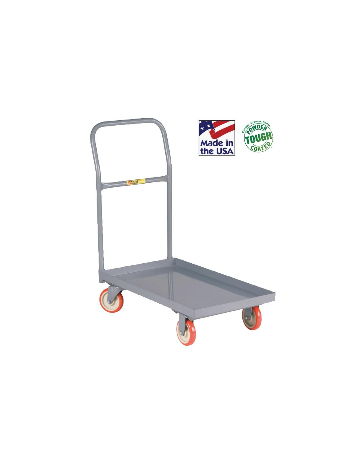 This solid, yet economical pallet truck is fully assembled and ready for use. These all welded steel pallet trucks are built for long, trouble-free service in medium duty applications. Removable cross-brace handle extends 28" high above the reinforced formed steel deck. Steel deck is available with flush edges or a 1-1/2" retaining lip. FOB Shipping Point.