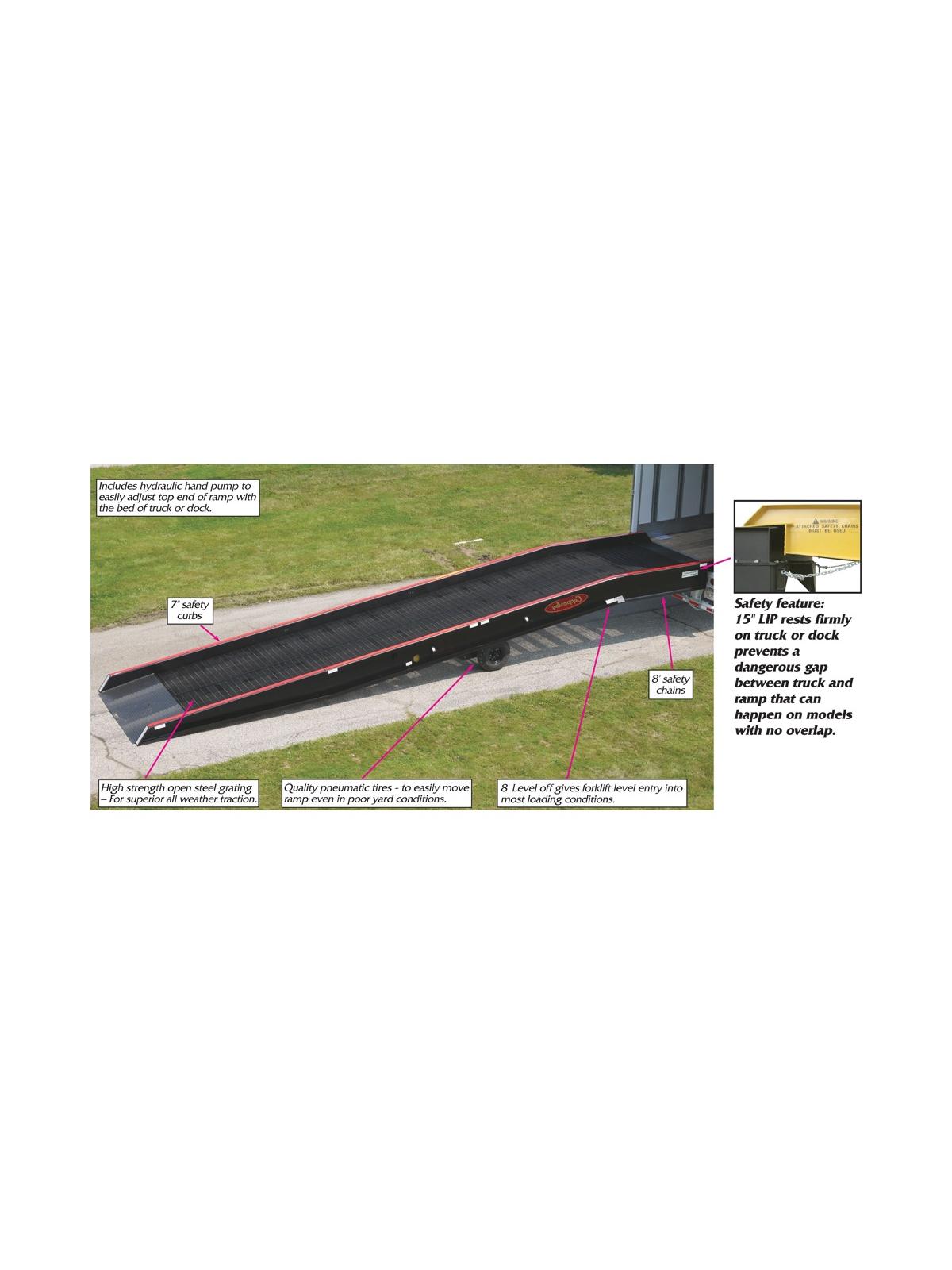 Safety feature: 15" LIP rests firmly on truck or dock prevents a dangerous gap between truck and ramp that can happen on models with no overlap.