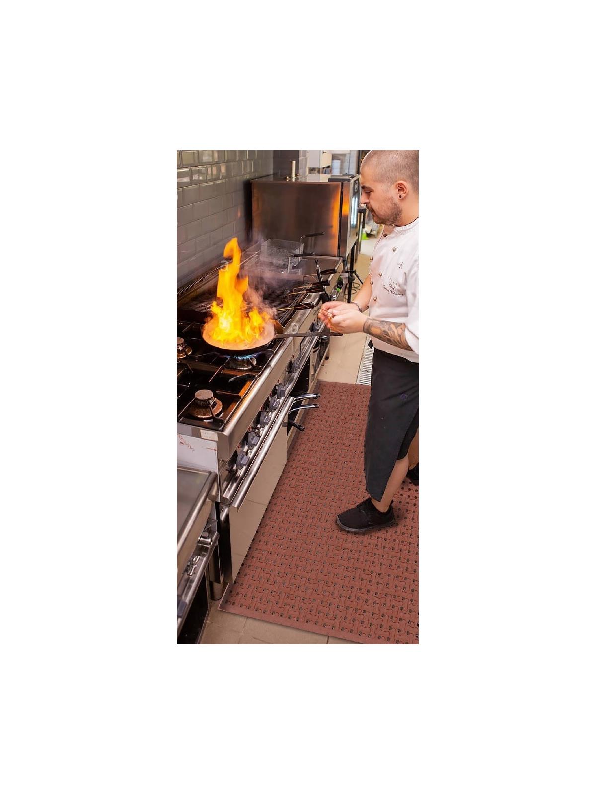 Popular food service mat with drainage holes that provides excellent traction for slippery floors. Reversible design can be flipped over, extending its usable life. Made from grease-resistant nitrile foam rubber (NBR). Universal design, perfect for kitchens, soda stations or entrance doors. Choose from Red 100% Nitrile or Black Nitrile SBR Blend. FOB Shipping Point.