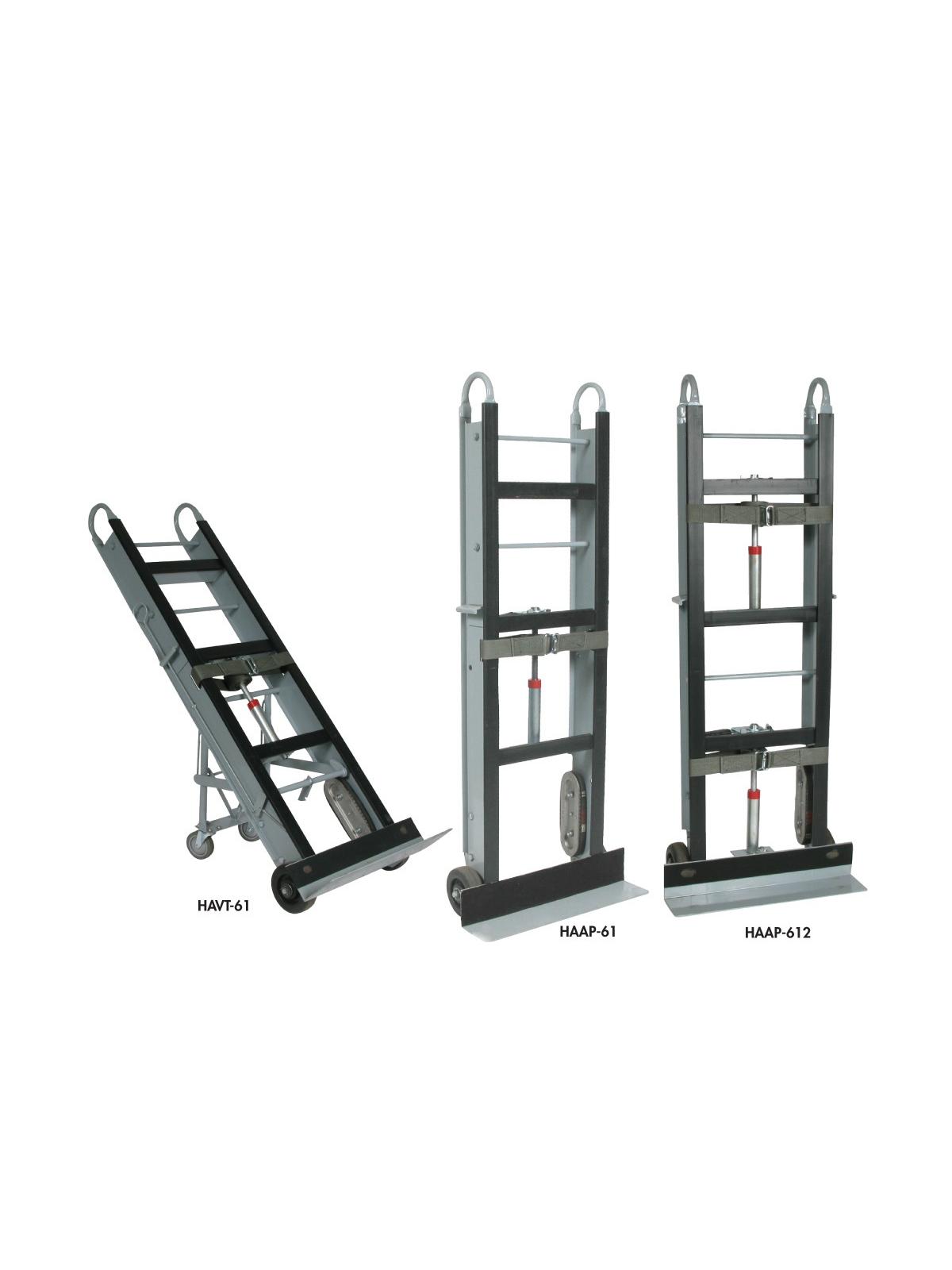 Lightweight aluminum frame with auto rewind ratchet. HAAP-612 has double ratchet design for greater cargo security. HAVT-61 has four wheel kick-out design with 2 x 1" casters to support heavy loads and help reduce the strain of balancing the cargo over long distances. Overall size is 24" W x 12"D x 61"H. FOB Shipping Point.