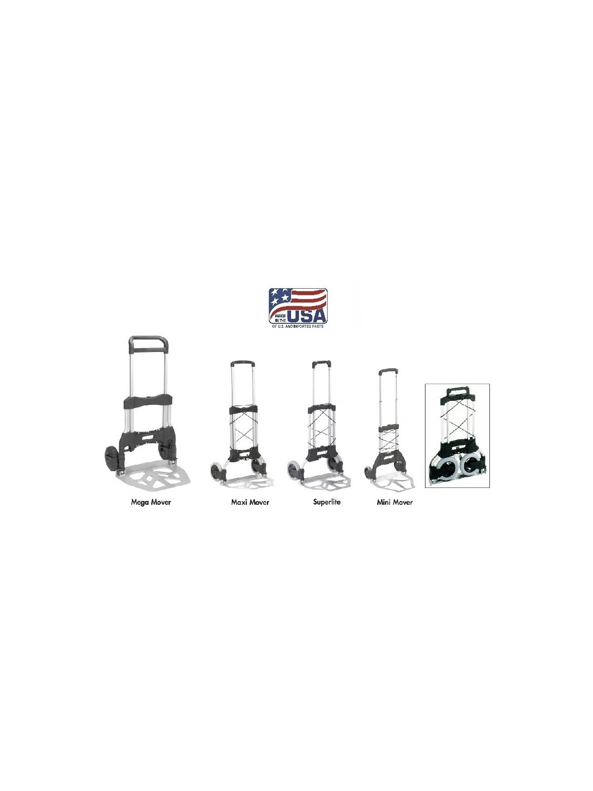 Features easy push button operation for quick set up. Pull down the noseplate and the wheels move into position. Space saving folding design - fits into small storage spaces or car trunks. Elastic straps for securing load. Rolls on non-marking shock absorbing rubber tread tires. Mini Mover fits into overhead airline compartments. FOB Shipping Point.