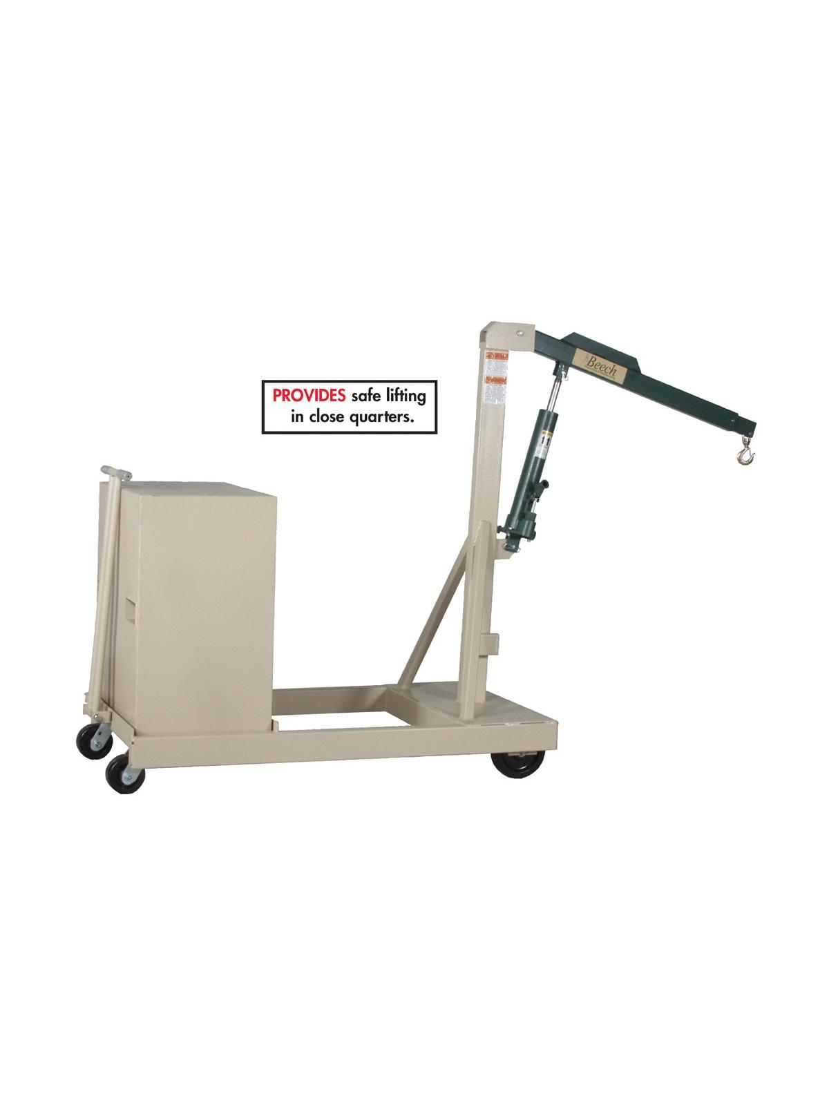 Each crane is proof loaded at 150% of its rated capacity to insure integrity and is equipped with a safety valve to prevent dangerous overloading. Hydraulic lift is controlled by a hand pump and precision lowering is regulated by a needle valve. All cranes are shipped complete with extension boom, safety swivel hook, counterweights, steering handle and roller bearing phenolic wheels. Exceeds ASME PALD-12 and ANSI Z535 standards. Optional wheels, floor lock and power lift option featuring deep cycle battery -- fully automatic charger plus a remote pendant on 20' coil cord available -- contact for details. FOB Shipping Point.