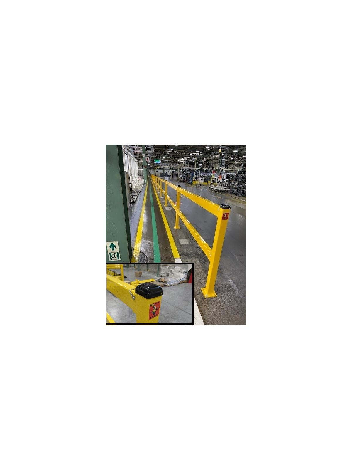 The Twin Rail comes standard with Quick Release Lift-Out rails that offer holes for bolting together if desired. Posts are 3" x 3" x 44" and meet OSHA for fall protection guidelines. The posts are available in End, Inline, and Corner options. The rails are strong 4" x 2" tubular steel, all powder coated safety yellow. Black steel caps included. Floor mounting hardware available but not included. FOB Shipping Point.